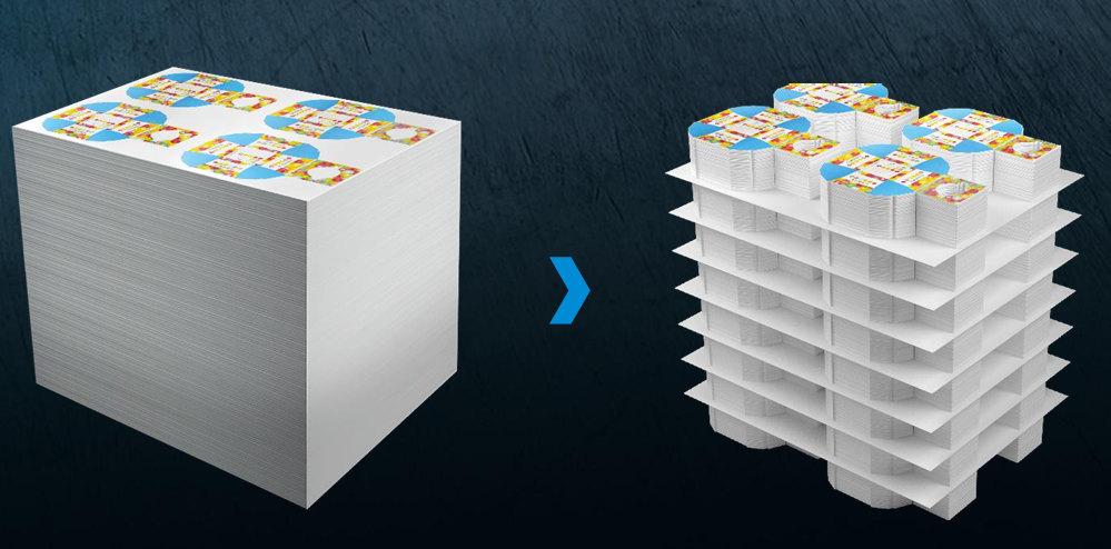 - Dokonale vytvořený stoh archů se může vytvářet na paletách, které jsou pohyblivé na kolejničkách a umožňují předstohování. Tím se vytváří důležitý předpoklad pro bezproblémovou výrobu a operátor může přesunout připravený stoh přesně a pohodlně do nakladače. (Max. výška stohu je do 1300 mm).