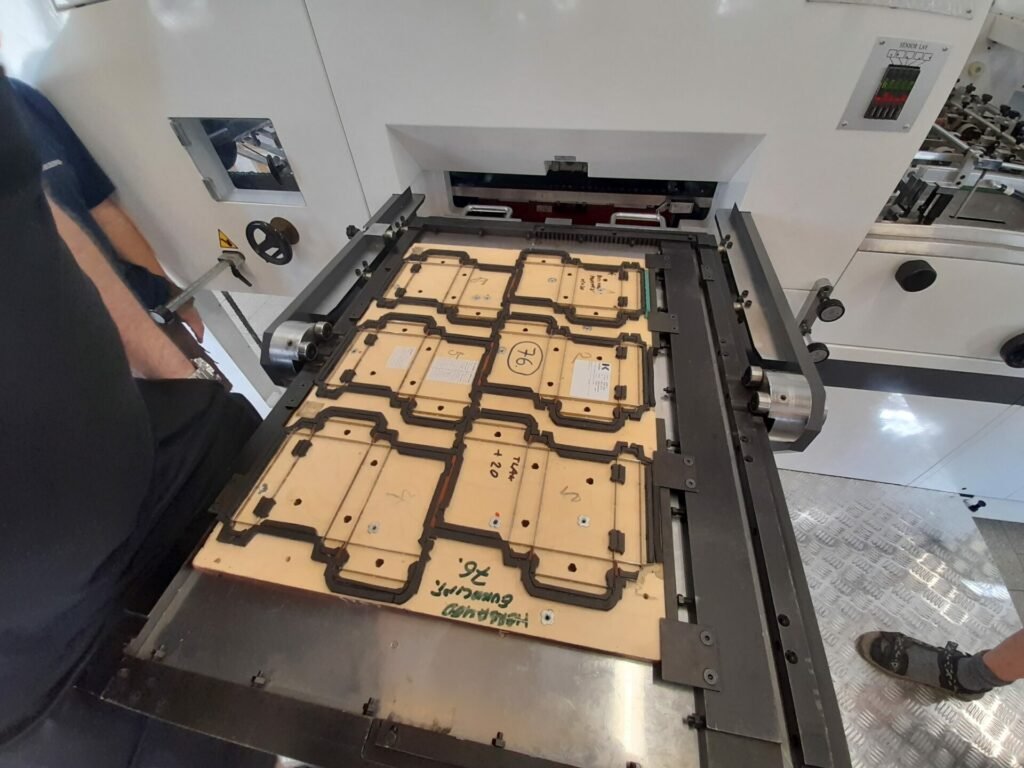• Na základě tloušťky archu bude na výsekovou desku instalována šablona s příslušnou šířkou a výškou. Ve chvíli, kdy arch vstoupí do jednotky tvarového výseku a dostane se do kontaktu s raznicí, bude dosaženo bigování.